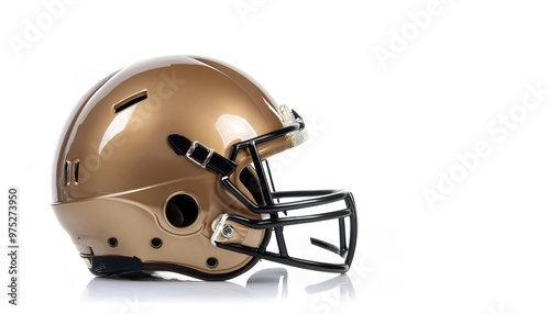 © Chase D’Animulls, Naklejka premium Gold Football helmet is a piece of head protective equipment from hard hits, concussions, injuries used mainly in American football and Canadian football. isolated on white background with copy space