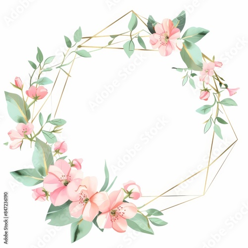 © Cetin, Fototapeta premium Gold geometric frame with a pink floral wreath on a white background