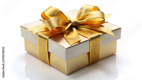 © Danial.Mehedi, Obraz premium Gold Gift Box with Gold Ribbon and Bow on White Background present birthday