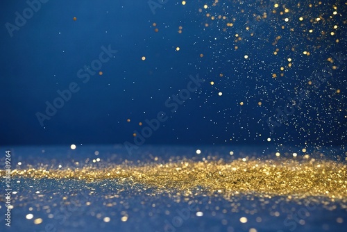 © Prasert, Obraz premium Gold glitter overlay on a deep blue background, gold accents, festive atmosphere