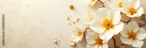 Fototapeta premium Gold & ivory blooms, beige linen background Subtle, luxurious feel , elegant,...