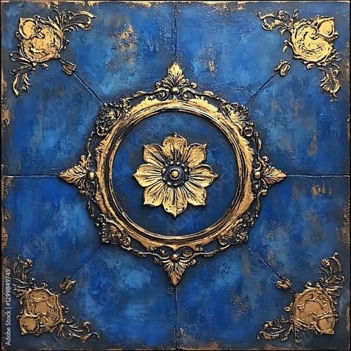 © Ardhana, Naklejka premium Gold Leaf Design Frame and Blue Floral Ornament Patterned Wall Art
