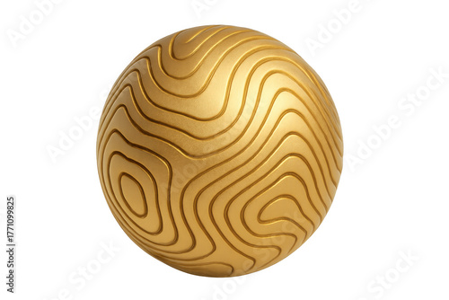 © Michael, Obraz premium Gold metallic sphere featuring carved topography-like contour lines, forming a unique abstract pattern. Transparent background