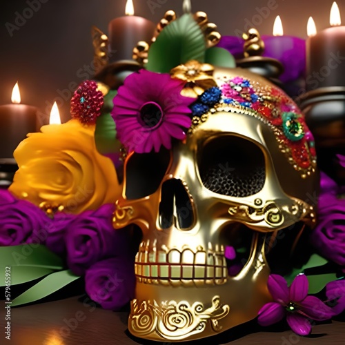 © Pictures Paradise, Fototapeta premium Gold mexican skullfor day of the dead with candles and flowers. Dia de los muertos. México. Ai generative