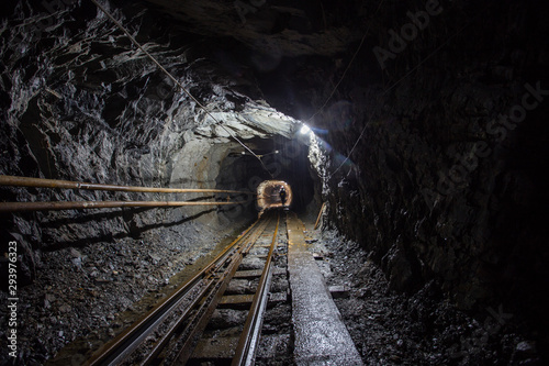 © Mishainik, Naklejka premium Gold mine ore shaft tunnel with rails