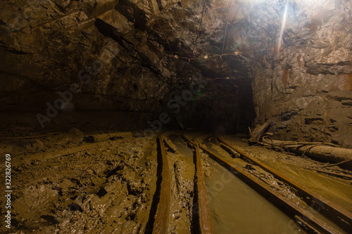 © Mishainik, Naklejka premium Gold mine underground tunnel with rails
