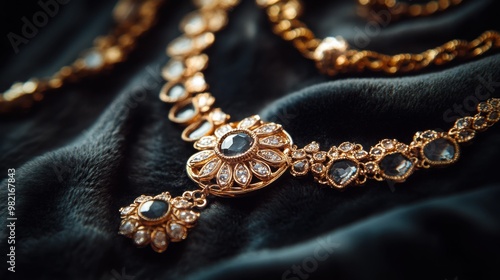 © Sergey, Fototapeta premium Gold Necklace with Precious Stones on Velvet Surface