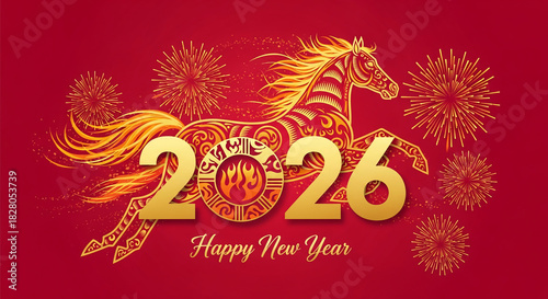 Fototapeta premium Gold ornamental horse and 2026 numbers with fireworks on a red backdrop,...