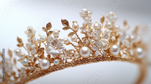 © mlangsen, Fototapeta premium Gold, pearl floral crown on white background, soft focus backdrop