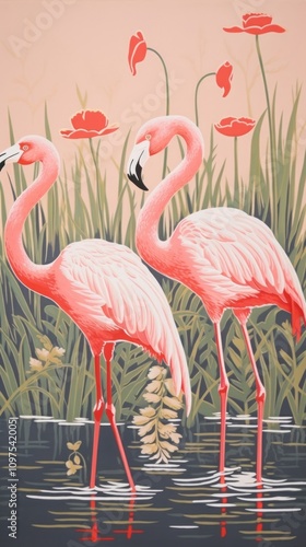 © Rawpixel.com, Fototapeta premium Gold pink silver flamingoes drawing animal nature.