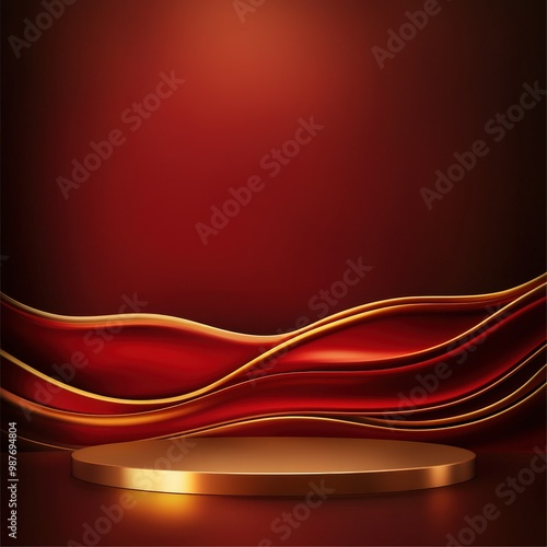 Fototapeta premium Gold Podium with Red and Gold Fabric Waves
