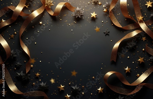 © miss irine, Naklejka premium Gold ribbons and stars scattered on dark background. Celebration elements like confetti and decorative shapes create festive atmosphere for events and parties.