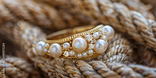 Fototapeta premium “Gold Ring with Pearl Beads Resting on Rope - Elegant Jewelry Design”