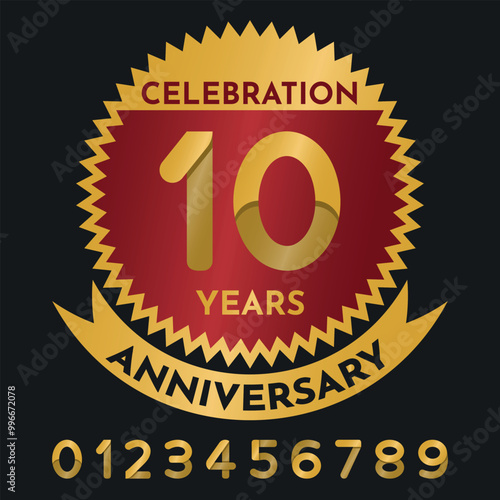 Fototapeta premium Gold Seal Anniversary Celebration - Gold and Ruby Seal in Zig Zag Circle with Ribbon and Personalized Numbers to Edit.