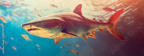 Naklejka premium Gold shark swimming with baby fish, orange and azure, aquamarine, varying perspectives. Generative Ai.