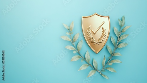 © Pixel Sculptor, Obraz premium Gold shield with checkmark, laurel wreath, light teal background