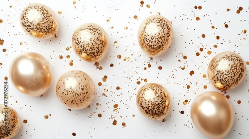 © Rakyandani, Fototapeta premium Gold shiny confetti and gold balloons on white background, middle has open space for your message copy, Celebration and party invitation concept