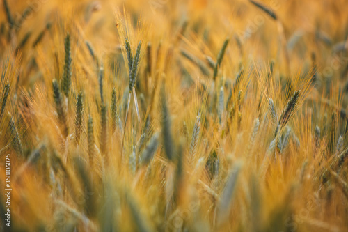 © danieleorsi, Obraz premium Gold wheat field grow in the cultivated soil during a sunny day. Conceptual images