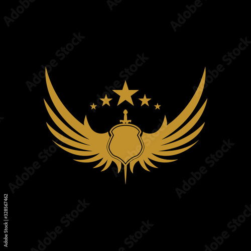 © Sunar, Obraz premium Gold winged sword with shield vector icon.