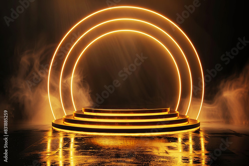 Obraz premium Golden abstract round stage for award on dark background with smoke.