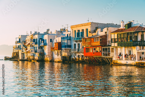 Obraz premium Golden afternoon in Little Venice famous dining and cafe neighborhood in Mykonos, Mykonos island, Cyclades, Greece