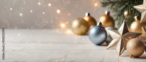 Fototapeta premium Golden and Blue Christmas Ornaments on Wooden Table