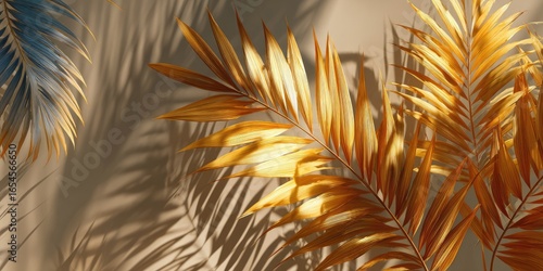 © Accordpansy, Obraz premium Golden and blue palm leaves cast shadows on a beige background