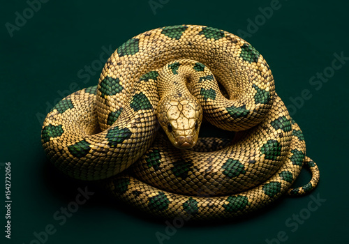 © Janos, Obraz premium Golden and green snake is coiled on a green velvet background, representing the snake zodiac symbol for the year