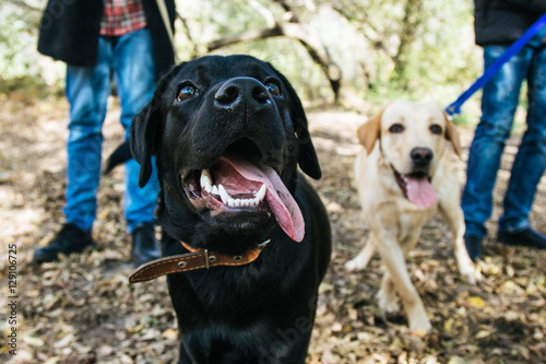 © Iryna, Obraz premium Golden and Labrador Retriever playing in the leaves