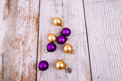 © Mitch Shark, Naklejka premium golden and purple christmas balls on rustic white wood