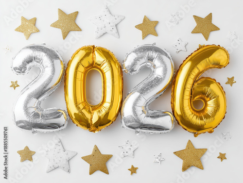 © Robert Kneschke, Fototapeta premium Golden and silver balloons displaying year 2026 surrounded by festive stars