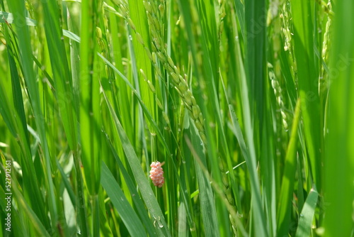 Fototapeta premium Golden apple snails eat young and emerging rice plants.