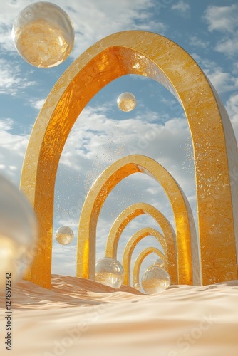 © Georgii, Obraz premium Golden arches and floating spheres in a dreamy desert setting