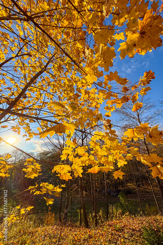© Olga Biliak, Fototapeta premium Golden autumn colors light up the countryside among old wooden houses and ancient churches in Ukraine, creating a warm nostalgic atmosphere.