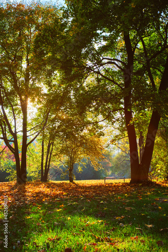 Naklejka premium Golden autumn fall October in famous Munich relax place - Englishgarten. Munchen, Bavaria, Germany