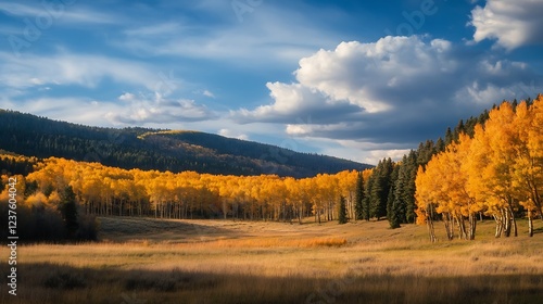 © Generative AI, Fototapeta premium Golden Autumn Field Surrounded by Lush Forest Under a Bright Blue Sky : Generative AI