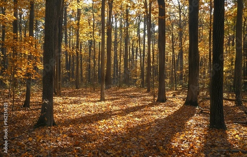 © Sevinj , Fototapeta premium Golden Autumn Forest in Tranquil Light, AI generated illustration