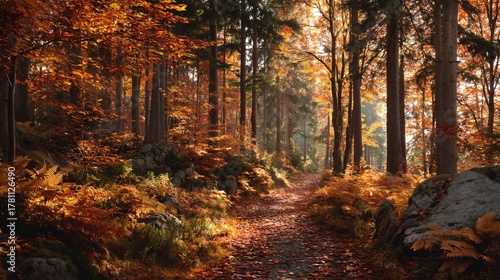 © Tanish, Obraz premium Golden Autumn Forest Path