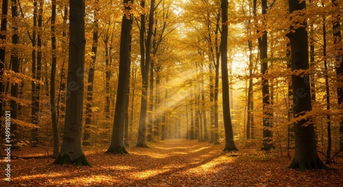 © yudistira, Fototapeta premium Golden Autumn Forest Path Sunbeams Through Autumn Leaves