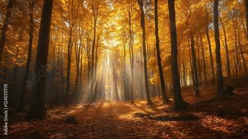 Fototapeta premium Golden Autumn Forest Path: Sunbeams Through the Trees