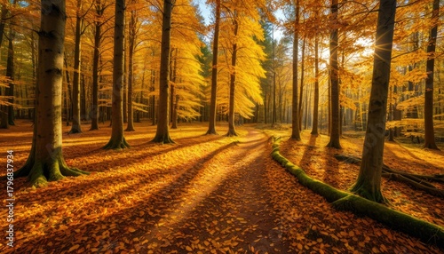 Obraz premium Golden Autumn Forest Path: Sunlight Streaming Through Trees, Fall Foliage,...