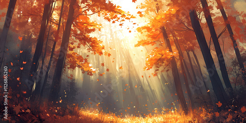 © jimmy Li, Naklejka premium Golden Autumn Forest Path with Sunbeams
