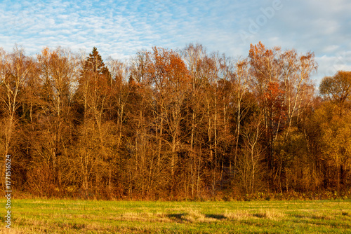 © PhotoChur, Fototapeta premium Golden autumn forest with bare birch trees bathed in warm sunset light, bordering a serene green field under a clear sky
