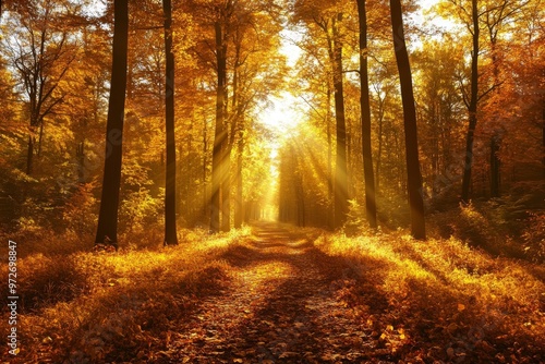 Obraz premium Golden Autumn Forest with Sunlight and Colorful Fallen Leaves
