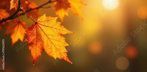 Fototapeta premium Golden autumn leaf shapes, blurred bokeh, abstract background, brown, organic