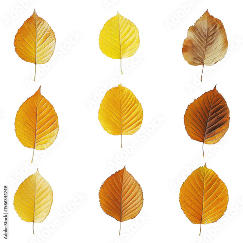 © Ifti Digital, Obraz premium Golden autumn leaves arranged in grid pattern on a white background showcasing seasonal colors, Golden Autumn Leaves, white background