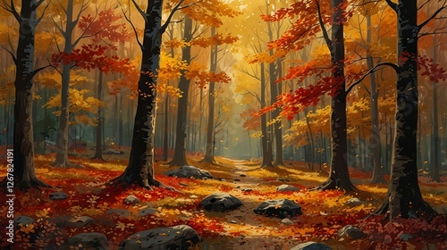 Fototapeta premium Golden autumn leaves drift to the forest floor, creating a soft, colorful...