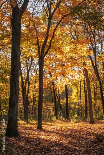 © atar, Obraz premium Golden autumn leaves on trees in forest