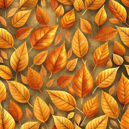 © Natalia, Obraz premium Golden autumn leaves scattered across a textured background in warm earthy tones
