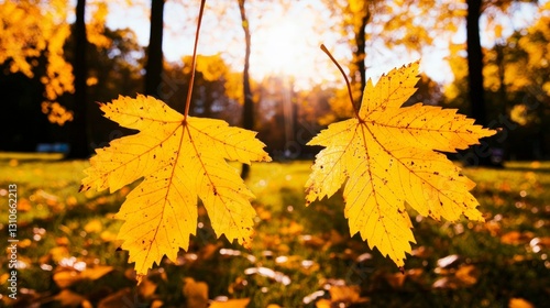 © Narongsag, Obraz premium Golden Autumn Leaves Sunlight Fall Foliage Nature Background
